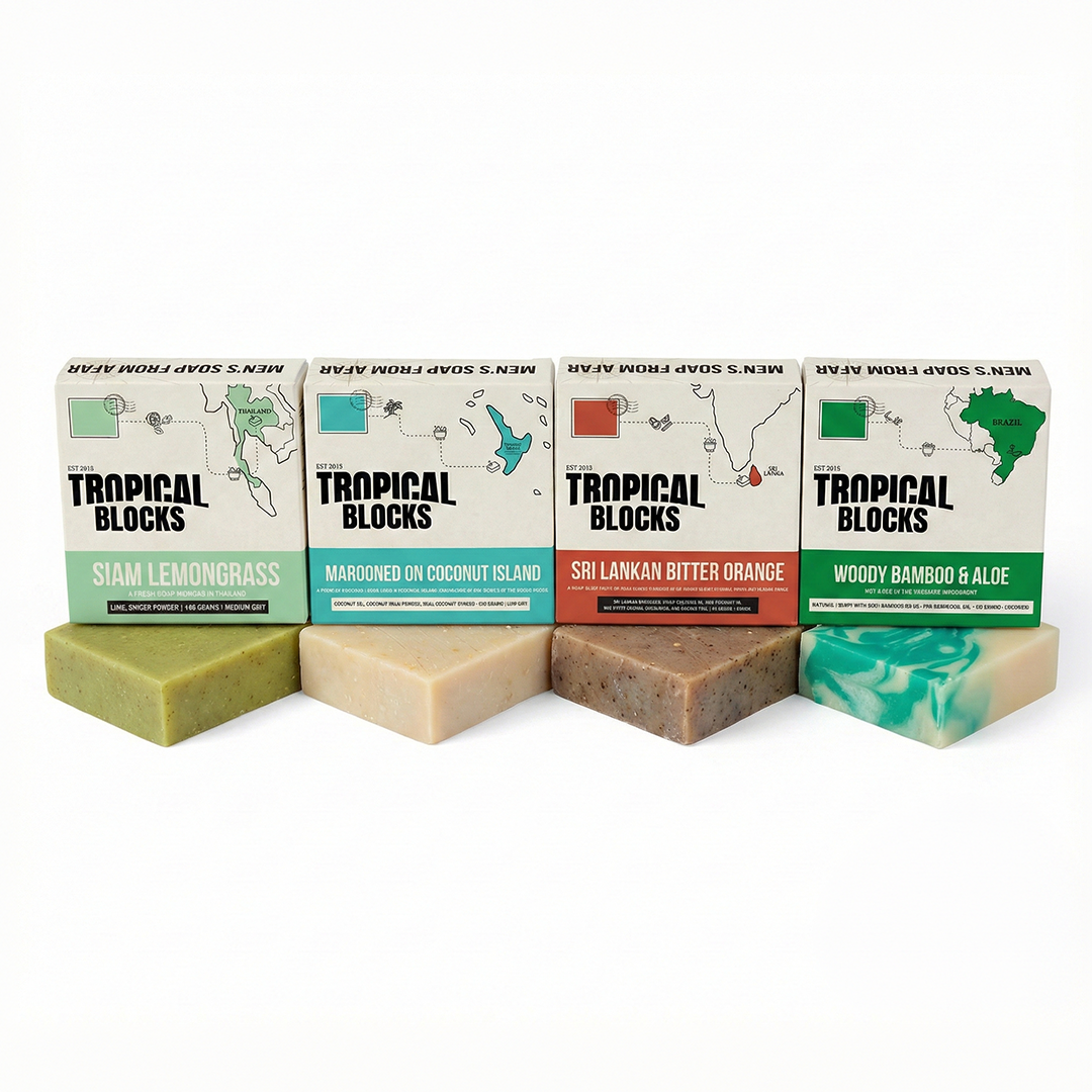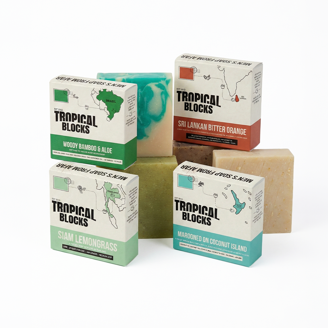 הסבונים המוצקים של Tropical Blocks לא מכילים כימיקלים, פרבנים או חומרים משמרים, ומהווים את הבחירה הטובה ביותר לעור הגברי